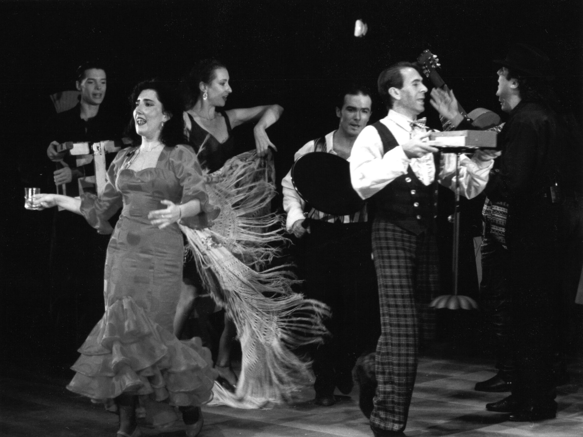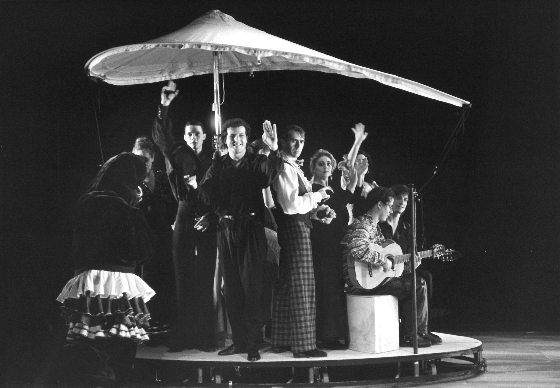 Die Choreografie spielt auf einem «Tiovivo», einer fahrbaren Drehscheibe, die sich in jeder Szene auf wunderbare Weise verwandelt. Flamencos en route begibt sich auf eine Rundreise, die auf verschiedene spanische Schauplätze führt, an Orte unmöglicher Begegnungen, in denen Don Juan, Don Quijote und Carmen sich ein Stelldichein geben. Das grosse Fest, auf dem das Karussell des unzerstörbaren Lebens seine ewigen Runden dreht, ist eine humorvolle Hommage und eine Verbeugung vor der mediterranen Heiterkeit.
